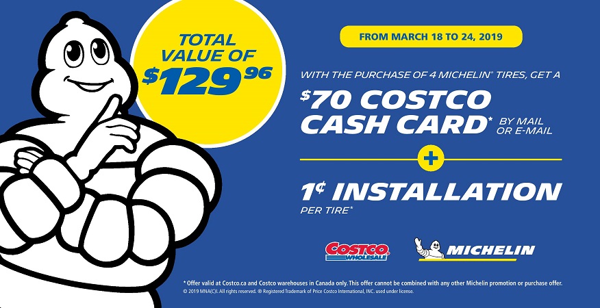 이번에 코스코에서는 미쉐린(Michelin)의 경우에만 4개의 타이어 구입시 $70 Costco eCash card 와 함께 3월 18일~24일 동안의 기간에만 개당 $15 설치비($15 installation package)에 대해 설치비를 개당 1센트로 해주는 프로모션을 진행했다. 예전에도 리베이트와 함께 무료 설치 프로모션을 동시에 한 적이 있는데 이런 경우 코스코에서 타이어를 교체하는 게 훨씬 이득이다.
