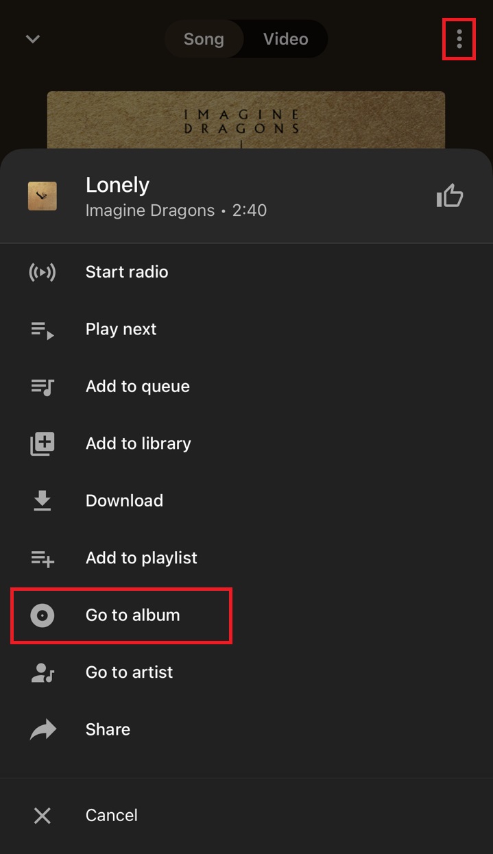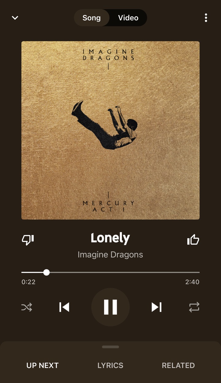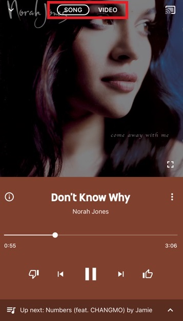 화면을 터치하면 비디오가 있는 경우 상단에서 선택 할 수 있다. 유튜브 뮤직 앱의 경우 음악과 영상을 재생시점에서 자연스럽게 전환 할 수 있는데 이런 부분은 유튜브 뮤직 앱만의 장점이다.