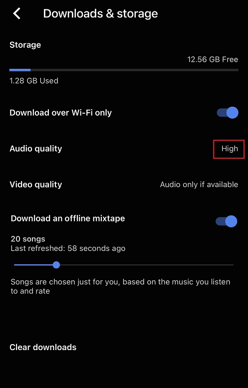 설정 > 오프라인 저장 및 저장용량 > 오디오 품질 > 높음