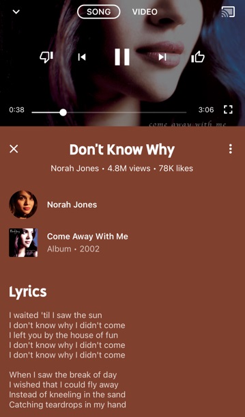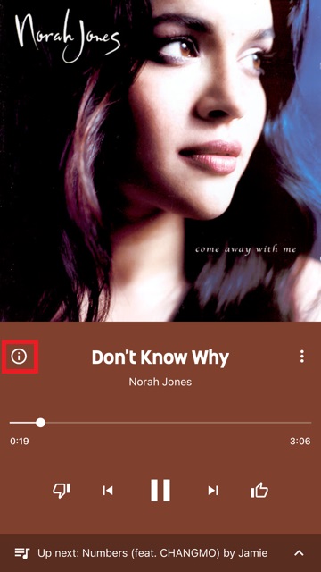 오프라인 저장 콘텐츠에서는 곡 정보를 볼 수 없다. 네트워크에 연결 된 상태에서만 정보를 볼 수 있다. 곡의 정보를 선택하면 가사를 볼 수 있는데 해외 음원의 경우 요즘은 가사가 꽤 지원되지만 한국 음원의 경우 가사 지원이 아직은 미흡하다.