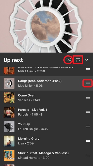 안드로이드 앱의 경우 모를 수가 없기 때문에 생략하고 iOS 앱을 기준으로 설명하자면 일단 음악을 하나 재생하면 하단에 리스트 보기를 위한 목록 펼치기 버튼이 있는데 그걸 터치해서 리스트 메뉴로 들어가야 셔플(shuffle:임의 재생) / 반복 모드를 설정 할 수 있다.